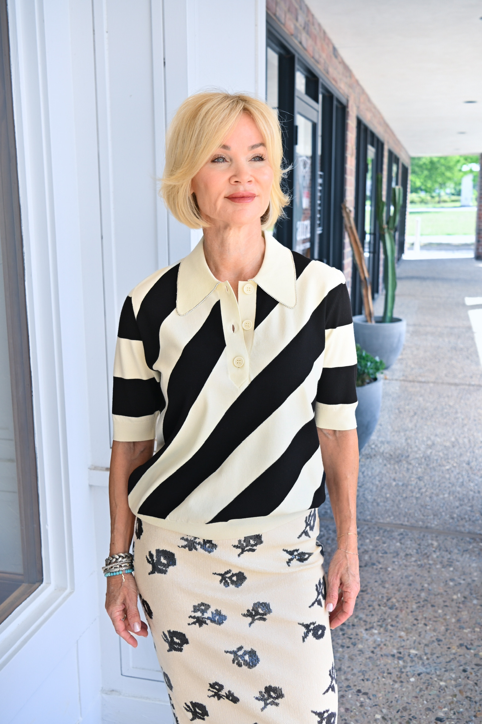 ESSENTIEL ANTWERP Joram Striped Knit Polo in Off White