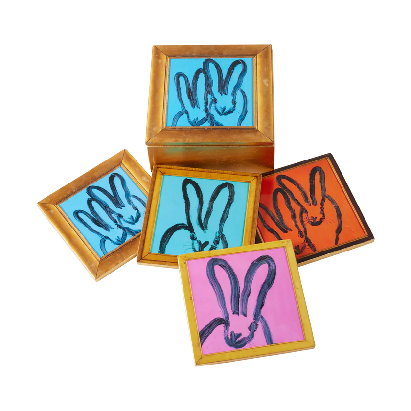 HUNT SLONEM Framed Bunnies Gold Leaf & Lacquer Coaster Box with 4 Coasters